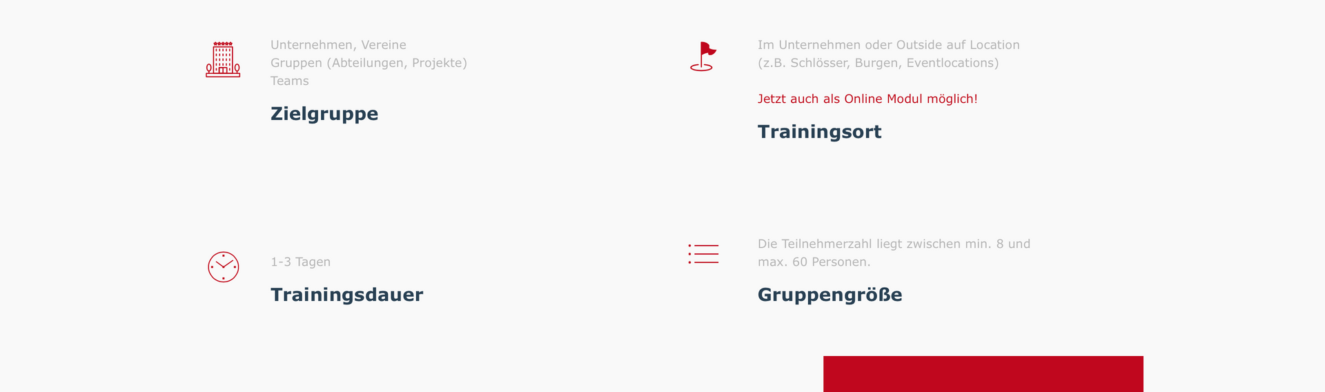 Αυτή η διαδικασία συνοδεύεται εντατικά από έμπειρους εκπαιδευτές, συμβούλους και ευέλικτους στοχαστές που εστιάζουν, εξηγούν και εξασκούν συγκεκριμένες πτυχές, όπως δεξιότητες στους τομείς της επικοινωνίας, της ανάπτυξης προσωπικότητας, της συνεργασίας και της πρόληψης συγκρούσεων.